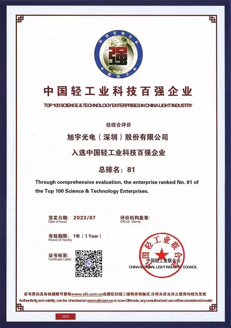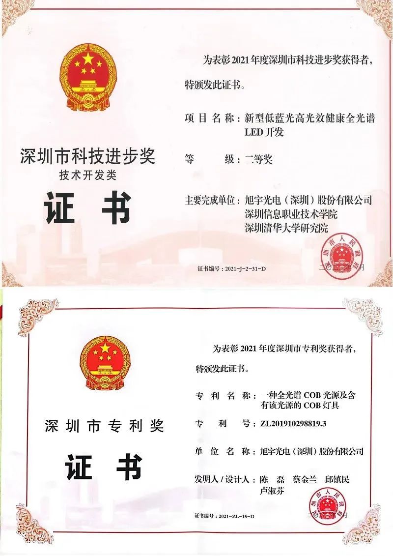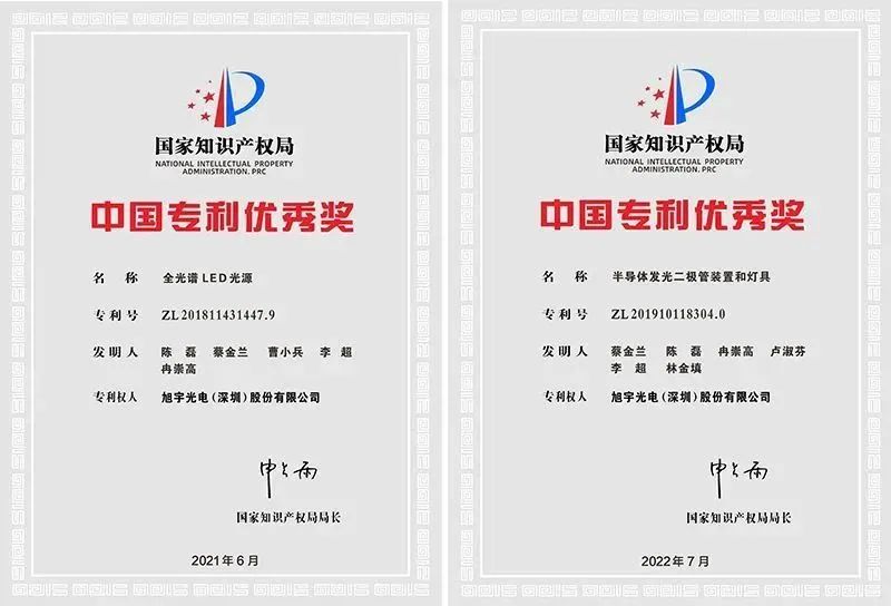目前,旭宇光电全光谱技术已取得相关授权专利30余项,其中专利“全光谱LED光源(ZL201811431447.9)”由于技术先进、RG0、防控近视、社会价值较高,获得国家知识产权局第二十二届中国专利优秀奖,也是当年全国LED照明应用封装领域唯一一家获得中国专利优秀奖单位;专利“半导体发光二极管装置和灯具(ZL201910118304.0)”获得国家知识产权局第二十三届中国专利优秀奖;由旭宇光电主持申报的“新型低蓝光高光效健康全光谱LED开发”项目荣获2022年度中国轻工业联合会科学技术进步奖一等奖,该项目还获得深圳市科技进步奖,并通过中国轻工业联合会科技成果鉴定,被认定为“技术处于国际先进水平”;发明专利“一种全光谱COB光源及含有该光源的COB灯具(ZL201910298819.3)”荣获深圳市专利奖。此外旭宇光电率先在行业内主导制定全光谱产业技术标准,并被深圳市计量质量检测研究院纳为执行3A评级标准。同时,旭宇光电还入选中国轻工业科技百强企业。
