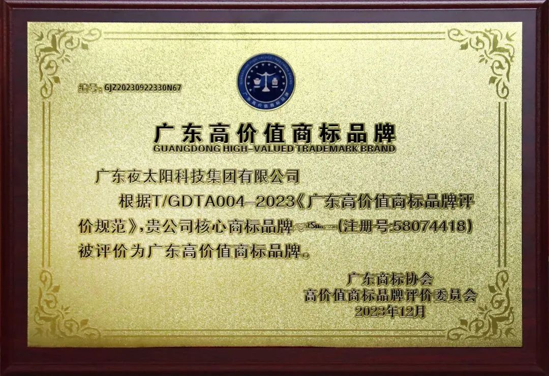 2023年7-9月,夜太阳分别参加了有关商标的两项重要评选:首先是由广东商标协会联合广东财经大学以及相关行业(专业)协会、市(区)商标协会等单位组织举办的“2023我最喜爱的广东商标品牌TOP100”评选;其次是参与了由广东省市场监督管理局指导、广东商标协会和广东省照明电器协会主办的“广东省照明行业高价值商标品牌”申报,在2023年接近尾声的时候,“双双入选”的喜讯传来,在“2023广东商标品牌年会暨成果发布”活动上,两项商标届最有分量的证书的颁发,为夜太阳的2024年开了一个奋进好兆头。