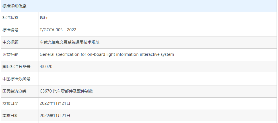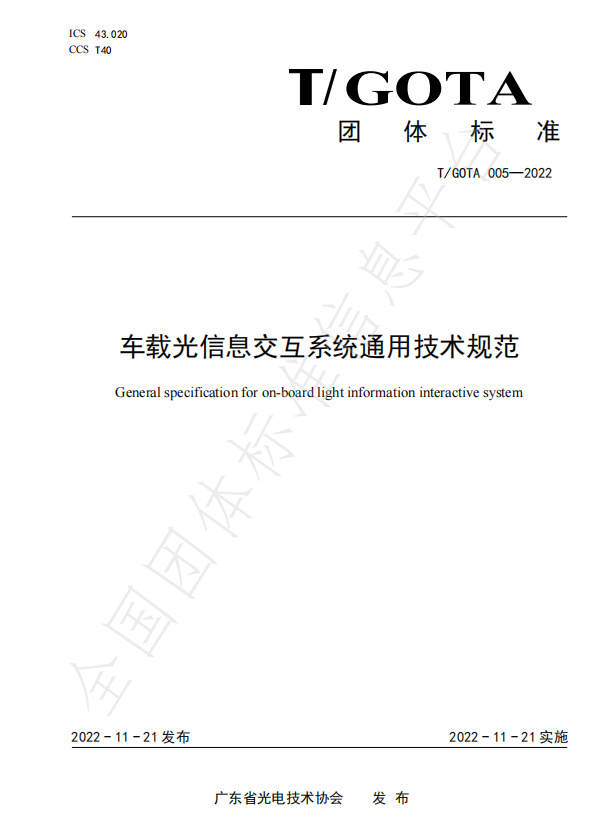近日,由广东省光电技术协会提出,佛山电器照明股份有限公司、深圳市聚飞光电股份有限公司、广州汽车集团股份有限公司汽车工程研究院等企业牵头发起的团体标准《车载光信息交互系统通用技术规范》T/GOTA 005—2022,通过了专家组的严格审查并发布,这标志着我国首个车载光信息交互系统团体标准正式诞生。