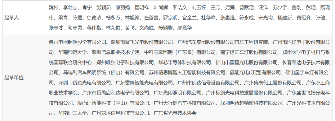 该标准由广东省光电技术协会提出,并牵头佛山照明、聚飞光电、广汽研究院、浩洋股份、华南师范大学、深圳信息学院、中科芯耀、南宁燎旺、郑州大学、郑州唯独电子、华芯半导体、国星光电、长春希达、马瑞利、苏州精思博智、晶能光电、佛山星宇、韦侨顺光电、雷腾智能光电、佛达信号、集泰股份、广东农工商职院、启利达电子、先朗照明、标旗光电、盛世飞扬光电、爱而适智能科技、天行健汽车科技、明智超精密科技、广州光科技术、华南理工大学等33家单位,历时一年,通过广泛调研和8次讨论反复修改完成。
