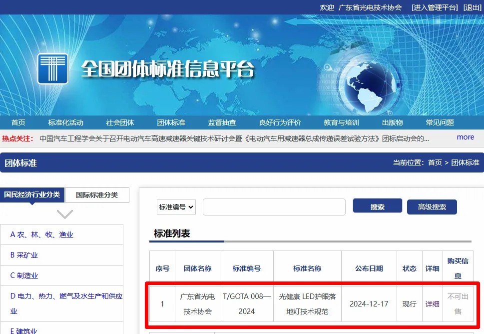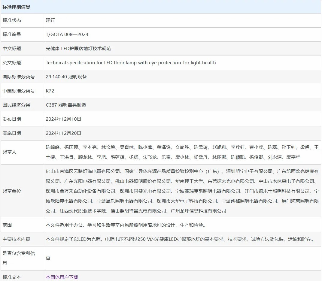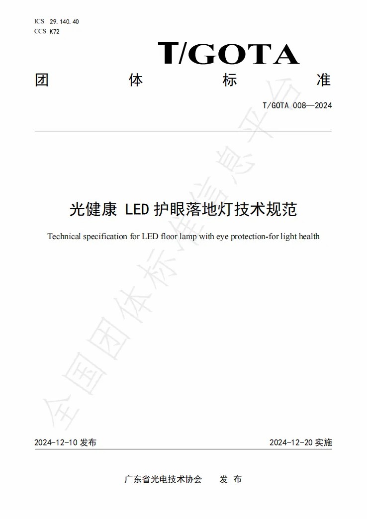 近日,由云路灯饰、国家半导体光源产品质量检验检测中心(广东)、旭宇光电、凯西欧光健康、广东光阳、佛山照明、华南理工等主要单位编写的《光健康 LED护眼落地灯技术规范》T/GOTA 008—2024团体标准,通过了专家组严格审查并正式发布。