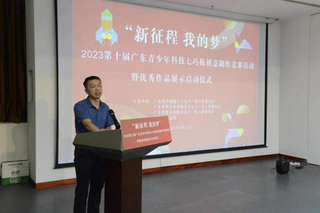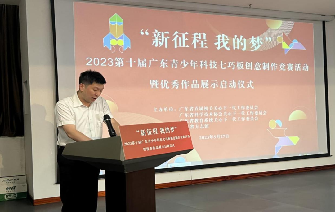 2023年5月27日上午,在省关工委、省科协、省振兴科技基金会等单位指导支持下,省直机关关工委、省科协关工委、省教育系统关工委联合省方志馆、省光电技术协会、全国七巧科技活动广东宣传推广服务中心共同举办“新征程 我的梦”2023第十届广东青少年科技七巧板创意制作竞赛活动暨优秀作品展示启动仪式。在启动仪式前,主办单位播放了2022第九届广东青少年科技七巧板创意制作竞赛颁奖典礼盛况视频。